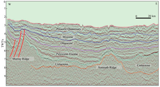 The Indus Fan stands as the world’s second-largest deep-sea fan, situated within Pakistan’s exclusive economic zone in the Arabian Sea. The exploration focus extends to the upper Indus Fan, and the adjoining shallow-water continental shelf area has captured significant attention. To date, 14 wells have been drilled in the nearshore basin of the Indus Fan. Regrettably, only one, Well Pakcan-1, encountered natural gas within the continental shelf area [41]; however, it did not meet industrial production standards. Well-core tests reveal that the Upper to Middle Miocene shales serve as excellent to very good source rocks in this region, exhibiting an approximate thickness of 300 m and an average total organic carbon (TOC) content of 2%. It is hypothesized that potential source rocks in the Indus Fan area primarily belong to the Cretaceous and Paleogene shales, predominantly characterized by Type III organic matter, spanning from maturation to over-maturation [42]. The reservoir predominantly consists of Miocene sandstones and Paleocene reef limestone or shoal limestone (Figure 4). Among these, the Miocene sandstones, encountered in Well PakCan-1, range from 2 to 50 m in thickness with porosities between 15% and 20%. The reef limestone and shoal limestones from the Paleocene to Eocene, discovered in Well PaK-G2-1, exhibit porosities exceeding 20% [43]. While the entire region lacks a continuous shale cap rock, the localized development of shale cap rocks is evident, particularly in the thick upper segments of the Middle Miocene shale layers. These cap rocks are widely distributed and can serve as regional cap rocks. The latest seismic data interpretation suggests that the nearshore basin of the Indus Fan features multiple source rocks, with both Miocene fluvial sand in the continental shelf area and Eocene reef limestone in the deepwater region being prevalent, indicating excellent reservoir quality and promising prospects for oil and gas exploration in the deepwater areas (Figure 5).