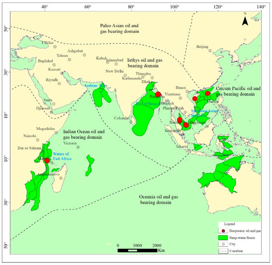 Global deepwater oil and gas resources are abundant, establishing a new frontier that supports the future development of international oil companies. As oil and gas exploration technology advances and exploration activities persist, the volume of deepwater oil and gas resources has grown rapidly, positioning it as a significant player in the global energy market [9,16]. In the past decade, newly discovered offshore oil and gas reserves have accounted for 60% of the global total, with the deepwater to ultra-deepwater sector contributing 61.99% of these discoveries [17]. The regions along the Maritime Silk Road, hereinafter referred to as the Silk Road, harbor numerous deepwater basins, making it a global hotspot for oil and gas exploration. It is also a primary focus for China’s offshore oil and gas exploration and development cooperation, fostering collaboration on energy resources with relevant countries. This is of utmost importance for ensuring national energy security and advancing the vision of the “21st Century Maritime Silk Road”.