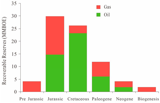 Relationship between deepwater recoverable reserves and hydrocarbon source rock ages.