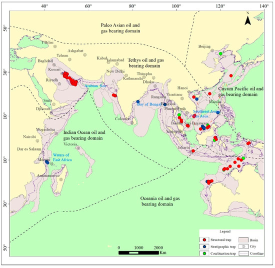 In the nearshore areas of the Bay of Bengal, the exploration level for oil and gas is relatively high, but the deepwater region offers promising prospects. The Bay of Bengal, forming a vast river-delta system, gives rise to various types of continental margin basins with substantial organic matter input along the continental margin. The conditions for hydrocarbon accumulation are exceptional, particularly in the deep-sea regions where Neogene turbidite sandstones extend. The primary exploration goal is to identify lithological traps. In the eastern seabed of Pakistan’s waters, material primarily originates from the Indus River, resulting in the widespread distribution of Miocene river-channel sandstones and Eocene reef limestones in deepwater regions. These areas boast high-quality reservoirs and promising prospects for oil and gas exploration, with an emphasis on identifying lithological traps [41]. Southeast Asian waters, situated at the convergence of three major tectonic plates, have undergone complex tectonic evolution, resulting in various basin types. Hydrocarbon resources are concentrated in Cenozoic back-arc basins, rift basins, passive margin basins, and foreland basins. In the deepwater region of Southeast Asia, numerous thrust–fold belts have developed, prominently featuring structural traps. The conditions for hydrocarbon accumulation are excellent, with the primary objective being the identification of large structural-type oil and gas fields.