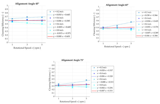 The results of the test runs show almost no dependence of the cleaning efficiency on the rotational speed. Nevertheless, there are weak correlations between efficiency and approach flow velocities combined with rotational speeds, similar at all three alignment angles: higher flow velocities combined with lower rotational speed result in higher cleaning efficiency. At the same time, low approach flow velocities combined with higher rotational speeds also result in higher cleaning efficiencies. The linear regression models for the individual flow velocities illustrate these slight trends very well. The minimal gradient in all linear regressions illustrates the low dependence of the cleaning efficiency on the rotational speed. The Root Mean Square Errors (RMSEs) for the linear regression models for all velocities are in the range of 0.06 for all three cases. Minor differences in the RMSE occur for the individual trends for each flow velocity regarding the alignment angle. For 45°, all RMSE values lie between 0.002 and 0.025; the RMSE value range extends from 0.005 to 0.054 for the two larger angles.