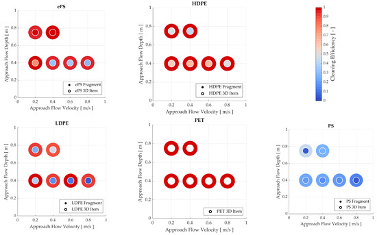 Figure 7 shows an apparent discrepancy between fragments and 3D items by examining their cleaning efficiency. While polymer 3D items, excluding for PS mugs, were removed with a minimum cleaning efficiency of 91% at all approach flow velocities and flow depths, removing fragments was significantly less efficient. The global average cleaning efficiency of 3D items is 82%, while PS items have the worst cleaning efficiency of 21%. If PS is excluded, the average cleaning efficiency for 3D items is 98%, close to 100%. Overall, the cleaning efficiency of PS is significantly worse for 3D items than for all other polymer types. The data show no clear correlation between cleaning efficiency, flow depth, and velocity in the case of 3D items for ePS, HDPE, LDPE, and PET polymer types.