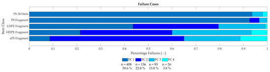 Failures at an alignment angle of 45° were classified according to failure cases and are summarized in Figure 8. The portions of the failure cases are related to the total amount of observations for unsuccessful removal per plastic category, leading to differing sample sizes per plastic category. We could not observe all losses during the experiments. Therefore, the data set is not comprehensive. Nevertheless, the observations provide a good overview of the proportions of the frequency of the failure cases to each other. These data indicate well the weak points of the cleaning system and thus potential for improvement.
