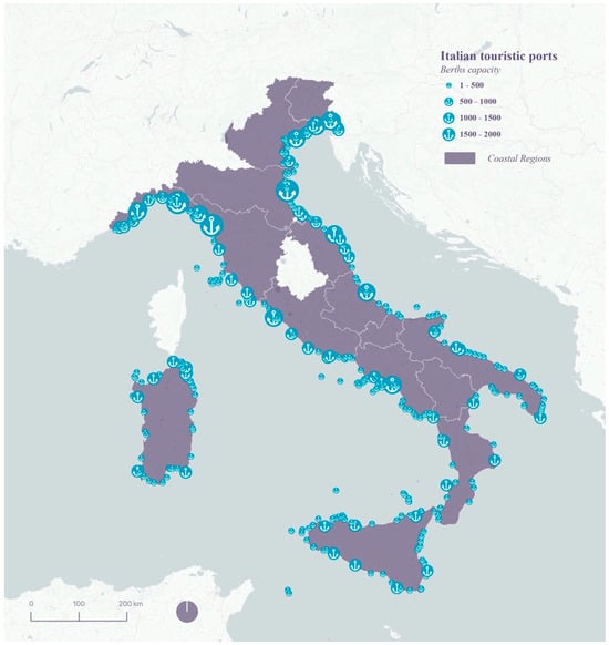 Italian touristic ports. Maps developed by the authors. Data source: SID il portale del mare. URL: https://www.mit.gov.it/documentazione/sid-il-portale-del-mare (accessed on 17 November 2023).