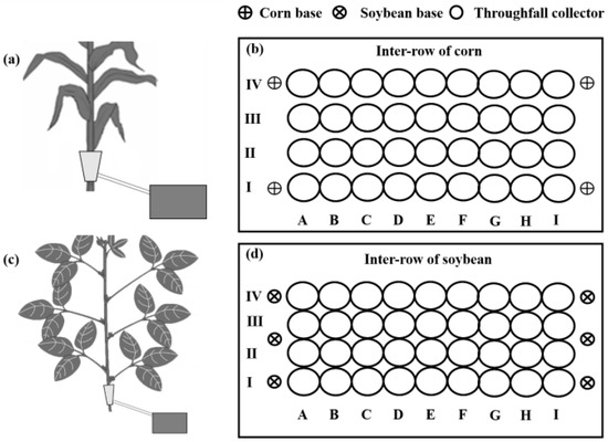 Figure 2. Schematic layouts of (a) the corn stemflow, (b) throughfall under the corn canopy, (c) the soybean stemflow, and (d) throughfall under the soybean canopy. A–I were the nine measurement sites distributed horizontally between two planting rows under the crop canopy. Ⅰ, Ⅱ, Ⅲ, and Ⅳ represented different positions parallel to the direction of the planting rows.