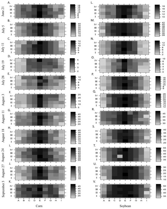 Figure 4. Horizontal variability of throughfall depth (mm) across the nine measurement locations under the canopy of (left) corn and (right) soybean in 2020. (A–I) were the nine measurement sites distributed horizontally between two planting rows under the crop canopy. (A.V.) were horizontal variability observations on different dates. Ⅰ, Ⅱ, Ⅲ, and Ⅳ represented different positions parallel to the direction of the planting rows.