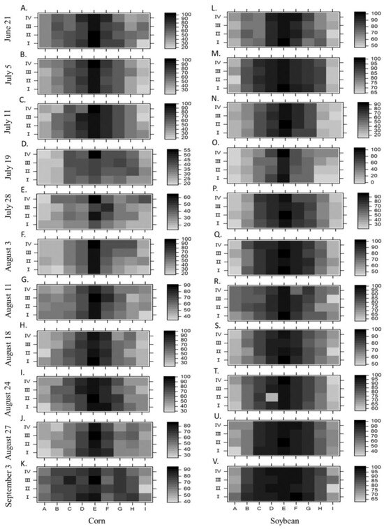 Figure 3. Horizontal variability of the throughfall depth (mm) across the nine measurement locations under the canopies of (left) corn and (right) soybean in 2019. (A–I) were the nine measurement sites distributed horizontally between two planting rows under the crop canopy. (A.X.) were horizontal variability observations on different dates. Ⅰ, Ⅱ, Ⅲ, and Ⅳ represented different positions parallel to the direction of the planting rows.