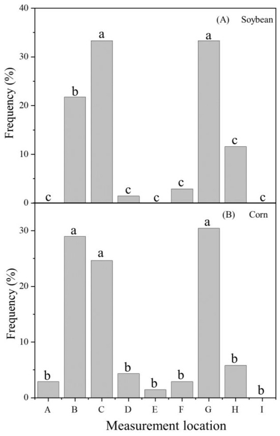 Figure 8. The proportion of individual measurement locations (A, B, C, D, E, F, G, H, and I) that best represented the mean throughfall from all the measurement locations from 2019 to 2020 under (A) soybean and (B) corn treatments, respectively. A, B, C, D, E, F, G, H, and I were the nine measurement sites distributed horizontally between two planting rows under the crop canopy. Different lowercase letters indicate significant differences between measurement locations at p < 0.05.