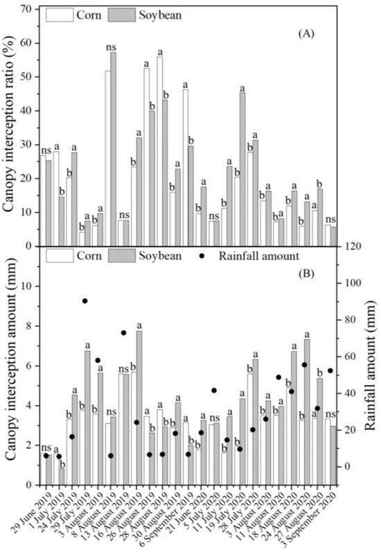 Figure 11. Characteristics of the canopy interception ratio (A) and canopy interception amount (B) of corn and soybean from 2019 to 2020. Different lowercase letters indicate significant differences between the corn and soybean treatments at p < 0.05. “ns” indicates no significant differences between the corn and soybean treatments at p < 0.05.