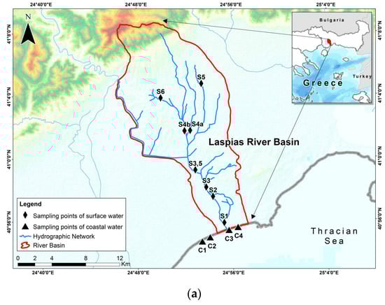 Within the European Union (EU), the Water Framework Directive (WFD) 2000/60/EC [] has been the major legislative driver that regulates the protection and the achievement of good ecological status in streams and rivers []. Hence, the WFD and the relevant national legislation impose the continuous monitoring of water bodies to detect pollution violations and deter the spread of associated hazards in inland, transitional, and coastal waters, as well as in groundwater []. In addition, the Marine Strategy Framework Directive requires all EU member states to maintain the ecological status of coastal waters at acceptable levels and to take all appropriate measures to prevent and limit marine pollution. Monitoring the quality in both river and coastal waters constitutes a crucial aspect for evaluating their quality status over the watershed. This is particularly important due to the potential pollution of the sea from river discharges, which may result in the contamination of benthic habitats, fish, and mollusks [].