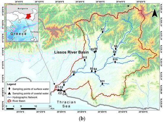 The Lissos River watershed is located in the Prefecture of Rhodope (25° 31′ E; 41° 01′ N), covering an area of 1486 km2, with a length of 45 km (Figure 1b). Parts of the Lissos are characterized as an HMWB (GR1209R00020000102H, GR1209R0002000091H, GR1209R0002030093H, GR1209R0002030095H, GR1209R0002030094H), while its estuary is protected by the Ramsar Convention. The Lissos River has been subjected to modifications, including channelization, embankment construction, and realignment, as a result of flood control and drainage works []. The Lissos watershed is near the WWTP of the Komotini industrial area, where the treated effluent discharges into water flow, while water quality is influenced by agricultural activities []. A characteristic example of an industrial entity in this region is the thermal power plant operated by the Public Power Corporation (DEI) []. Both rivers outflow to the coastal zone of the Thracian Sea, a marine area with important benthic habitats (mostly Posidonia oceanica) and pelagic fish stocks.