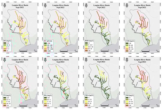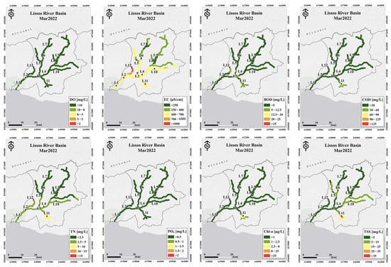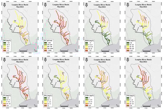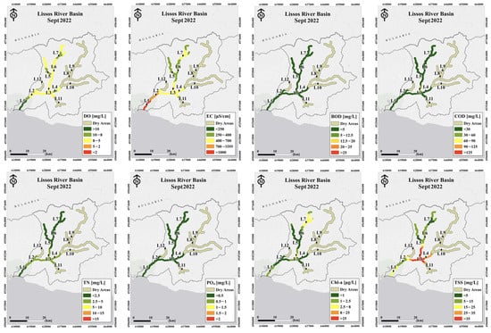 Map distribution of dissolved oxygen—DO [mg L−1], electrical conductivity—EC [μS cm−1], biochemical oxygen demand—BOD [mg L−1], chemical oxygen demand—COD [mg L−1], total nitrogen—TN [mg L−1], orthophosphates—PO4 [mg L−1], chlorophyll a—Chl-a [mg L−1], and total suspended solids—TSS [mg L−1] concentrations along the Laspias river basin based on water analysis for two sampling periods (March 2022 and September 2022). Labels L1–6 denote the locations of sampling stations. A five-level color classification was used: green color represents “very good” status, while red color “bad” status. Values were assigned to their respective colors through a modification of the WFD categorization scheme adopted by Greece.