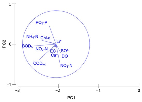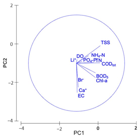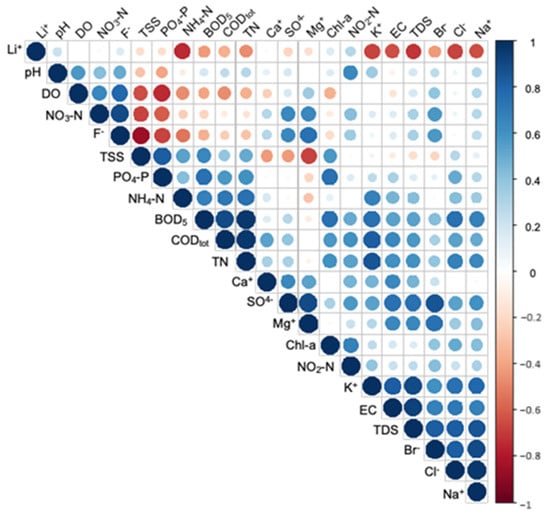 Regarding Spearman’s correlation analysis for the Laspias River, there were significant positive correlations between 18 pairs of parameters (TDS—EC, BOD5—CODtot, PO43−-P—TSSs, TN—CODtot, TN—BOD5, F−—NO3−-N, Cl−—TDS, Br−—TDS, Br−—Cl−, SO42−—Br−, Na+ -TDS, Na+—Cl−, Na+—Br−, K+—EC, K+—TDS, K+—CODtot, K+—TN, Mg2+—SO42−; p < 0.05, Figure 4).