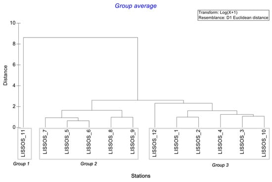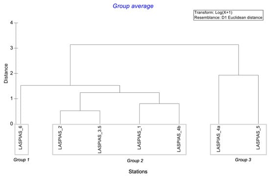 Additionally, cluster analysis [] was applied to the physicochemical parameters and nutrients to identify possible spatial patterns. The Euclidean distance similarity index was used for the extraction of the resemblance []. Then, similarity percentage analysis (SIMPER) was applied to determine which parameters and nutrients contributed most to the observed similarities and dissimilarities between groups, with a cut-off limit of 90% []. All the above statistical analyses were performed using Primer v6 software [].