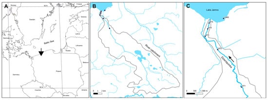 Map of sampling sites: (A) localization of Dzierżęcinka River in north-western Poland, (B) catchment of Dzierżęcinka River, (C) sampling sites along the river and in the lake. The arrow indicates the location of the river in Poland.