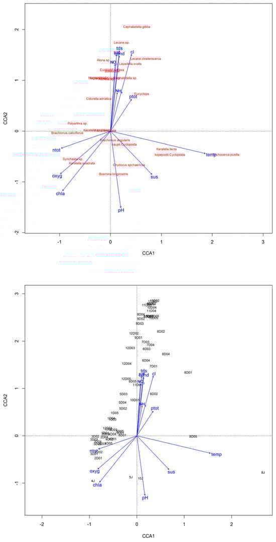 Zooplankton taxa abundance among environmental factors in the river Dzierżęcinka and Lake Jamno. Canonical correspondence analysis (CCA) constrained ordination of taxa from sites with different environmental conditions. Environmental variables: chla—chlorophyll a; oxyg—dissolved oxygen; temp—temperature; cl—chloride; cond—conductivity; tds—total dissolved solids; sal—salinity; NO3—nitrates; ptot—total phosphorus; notot—total nitrogen; sus—suspension matter; NH4—ammonia. In the site ordination plot, the first letter means month, the second letter denotes location (D stands for Dzierżęcinka, J stands for Jamno), and the last letter is the number of sites.