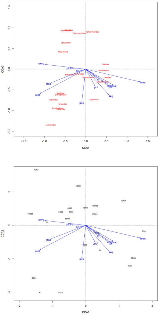 Macroinvertebrates taxa abundance among environmental factors in the river Dzierżęcinka and Lake Jamno. Canonical correspondence analysis (CCA) constrained ordination of taxa from sites with different environmental conditions. Environmental variables: chla—chlorophyll a; oxyg—dissolved oxygen; temp—temperature; cl—chloride; cond—conductivity; tds—total dissolved solids; sal—salinity; NO3—nitrates; ptot—total phosphorus; ntot—total nitrogen; sus—suspension matter; NH4—ammonia. In the site ordination plot, the first letter means month, the second letter denotes location (D stands for Dzierżęcinka, J stands for Jamno), and the last letter is the number of sites.