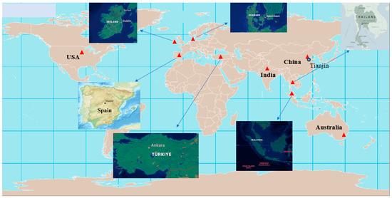 Specific location of the CW–MFC systems in the present study (Tianjin, China), and the top 10 most productive countries (represented by red triangle) in the CW–MFC study [6].