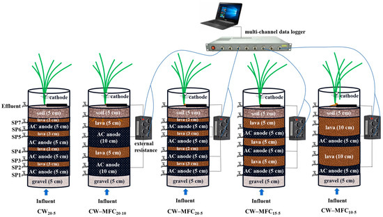 The constructed wetland coupled microbial fuel cell systems (CW–MFCs) have gained enormous academic interests owing to their ability to perform concurrent wastewater treatment and electricity generation. A typical CW–MFC system generally uses vertical up-flow CWs, and MFC anodes are placed at the anaerobic region formed near the bottom of CWs, while MFC cathodes are placed at the aerobic region formed near the plant roots or the CW substrates’ surface [1,2]. This arrangement can guarantee the redox gradient required for MFC operations. MFCs use electrochemically active bacteria (EAB) as biocatalysts to oxidize organic substances and generate electricity. EABs could efficiently rewire the reductive equivalence derived from the cellular metabolism to different reductase with sophisticated electron transfer pathways [3,4,5]. Therefore, MFCs are capable of promoting the degradation of bio-refractory organics in CWs [2,6]. Moreover, the bacteria on MFC cathodes can use the electrons produced by EAB to reduce nitrite (-N) and nitrate (-N) to N2, and thus enhancing the nitrogen removal in CW–MFCs [7,8]. Because electrode materials (e.g., carbon fiber, graphite, stainless steel, activated carbon) are relatively expensive, the construction cost of CW–MFCs are around 1.5 times higher than that of conventional CWs [9]. However, MFCs implemented in CWs would improve CWs’ treatment efficiency and reduce their surface area requirements, reduce clogging and its derived operation and maintenance costs, and reduce greenhouse gas emissions [2,6,9]. Taking all factors into consideration, CW–MFCs would be competitive with conventional CWs. The current CW–MFC system is in the pilot-scale and lab-scale stages, and the main challenges involve improving power densities and collecting and utilizing the generated electricity in full-scale CW–MFCs [6].