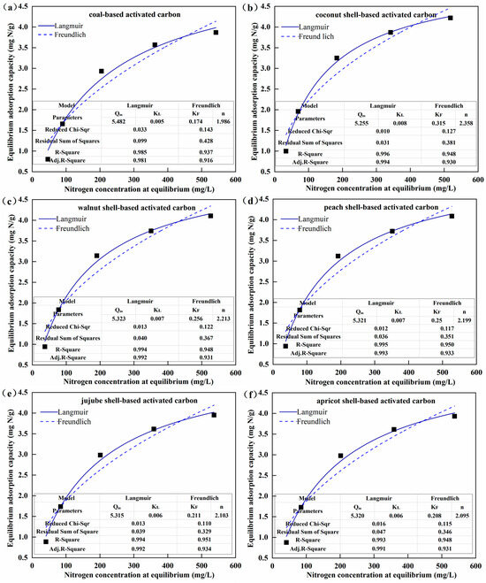 In the adsorption isotherm experiment, 2 g of AC of each type was added to 30 mL of NH4Cl solution, and the initial concentration of -N was 100 mg/L, 200 mg/L, 400 mg/L, 600 mg/L, and 800 mg/L. The solution pH was maintained at 7.0 using HCl and NaOH. The above solution mixture was shaken at 25 °C, 200 r/min for 24 h in a constant-temperature air oscillator, and then solution samples were taken and analyzed.