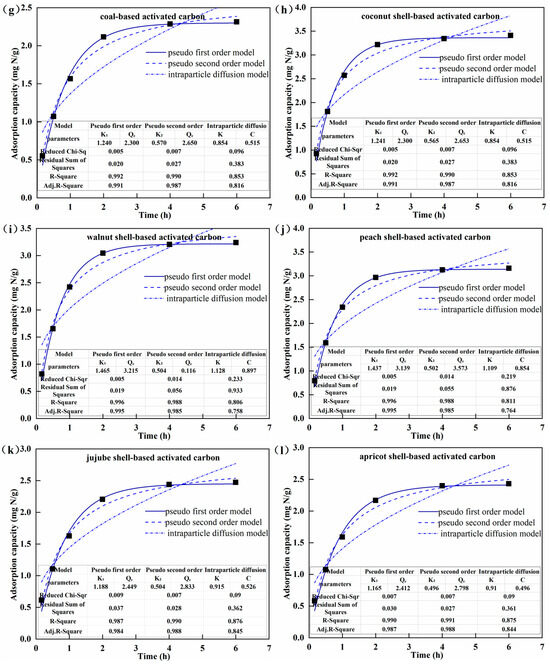 The adsorption kinetics of AC for nitrogen are provided in Figure 4g–l. The nitrogen adsorption capacity of all AC increased rapidly in the first hour and reached 65.4–75.4% of the maximum equilibrium adsorption capacity at 1 h. This was because at the initial period of adsorption, there were enough available adsorption active sites on the surface of AC, and the impetus of mass transfer, i.e., the NH3-N concentration difference between the solution and the surface of AC, was relatively larger. Then, the nitrogen adsorption rate slowed down after 1 h, and the equilibrium adsorption capacity reached 89.2–94.4% of the maximum at 2 h. Afterward, the nitrogen adsorption capacity increased extremely slowly and basically reached saturation at 4 h, indicating the full occupation of adsorption sites by ammonia molecules. Throughout the entire adsorption process, CS-AC always had the highest nitrogen adsorption capacity, followed by WS-AC, PS-AC, JS-AC, AS-AC, and C-AC, which was consistent with the adsorption thermodynamics results. Based on the higher R-Square, the lower residual sum of squares, and Chi-Square, the pseudo-first order model better described the nitrogen adsorption kinetics of the six types of AC than the pseudo-second order model and the intraparticle diffusion model. This indicated that the nitrogen adsorption by AC tended to be a linear process in which physical adsorption played a leading role.