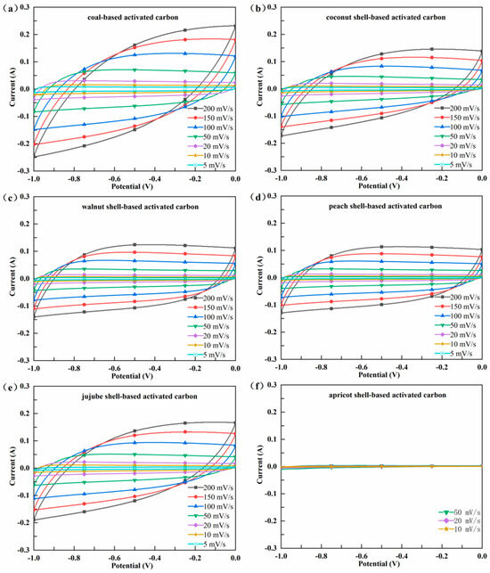 Cyclic voltammetry (CV) curves of the activated carbon (a–f).