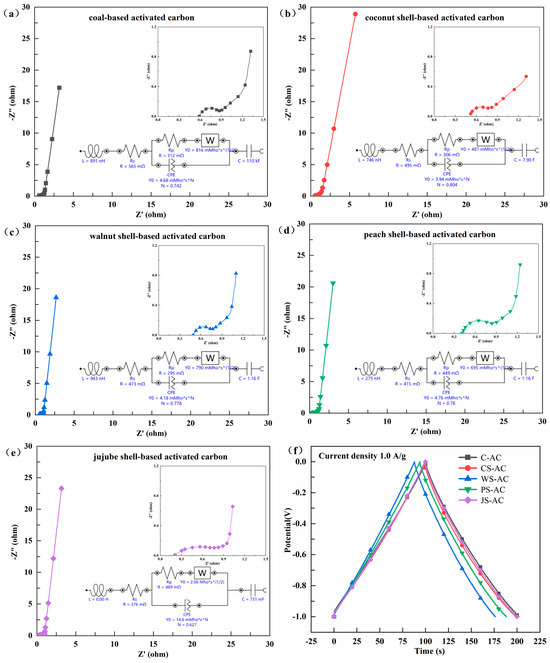 Nyquist plot and fitted equivalent circuit diagram for EIS test (a–e), galvanostatic charge/discharge (GCD) curves (f) of the activated carbon (C-AC, coal-based activated carbon; CS-AC, coconut-shell-based activated carbon; WS-AC, walnut-shell-based activated carbon; PS-AC, peach-shell-based activated carbon; JS-AC, jujube-shell-based activated carbon; *, multiplication sign).