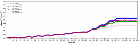 The CS-AC was selected as the CW substrate and the MFC anode because of its higher nitrogen adsorption capacity and better electrochemical properties as compared to other types of AC. As illustrated in Figure 7, the output voltage of the four integrated CW–MFCs showed the same pattern of change. After starting the CW–MFCs, an initial voltage of 0.0176–0.0184 V was observed only approximately 4 h later, which may be due to the chemical and biological reactions caused by the potential difference between cathode and anodes [29]. Then, the output voltage of the CW–MFCs started to increase slowly approximately 50 h later, and the voltage slightly decreased at night because of the light and cooling but showed an overall “fluctuating” upward trend until it reached 0.1637–0.1661 V after another 173 h (about 7.2 days), during which the EAB might be in competition with other microbial populations. Afterward, the increase of the voltage sped up; moreover, the output voltage of the four CW–MFCs started to differ from each other. After another 86 h (about 3.6 days), CW–MFC20-5 achieved the highest reproducible maximum voltages (≈0.54 V), followed by CW–MFC20-10 (≈0.49 V), CW–MFC15-5 (≈0.46 V), and CW–MFC10-5 (≈0.35 V), and the corresponding maximum power densities were 25.71 mW/m3, 21.17 mW/m3, 18.66 mW/m3, and 10.80 mW/m3, respectively. It took nearly 13 days for EAB to adapt and successfully attach to anodes.