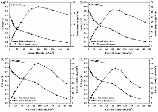It was obvious that the maximum power density of CW–MFCs was positively correlated with the total depth of AC anodes, which was in line with expectations. This was because that the more activated carbon provided a higher total adsorption capacity for pollutants and more attachment surfaces for microorganisms, thereby facilitating the adsorption and biodegradation of pollutants as well as the enrichment and function of EAB. Specifically, the maximum voltage and power density of CW–MFC15-5 were higher than that of CW–MFC10-5 by 31.4% and 72.7%, respectively, but were lower than that of CW–MFC20-5 by only 17.4% and 37.8%, respectively. This demonstrated that the increase in the electricity generation of CW–MFCs would slow down or even stop as the total depth of AC anodes increased to a certain value. This was probably subject to the influent organic loading because the influent organics were unable to provide unlimited carbon sources and electron donors for EAB. The maximum voltage and power density of CW–MFC20-10 were lower than that of CW–MFC20-5 by 9.3% and 17.7%, respectively, and were higher than that of CW–MFC15-5 by only 6.5% and 13.5%, respectively, which indicated that the depth of a single AC anode also influenced the electricity generation of CW–MFCs.
