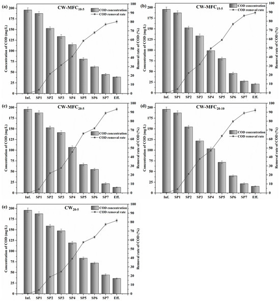 The organics removal in CW–MFC systems is provided in Figure 9a–e. CW–MFC20-5 achieved the highest COD removal (93.30%), followed by CW–MFC20-10 (92.10%), CW–MFC15-5 (89.40%), CW20-5 (81.70%), and CW–MFC10-5 (80.20%), and the corresponding removal load was 38.34 g·m−3·d−1, 37.85 g·m−3·d−1, 36.74 g·m−3·d−1, 33.58 g·m−3·d−1, and 32.96 g·m−3·d−1, respectively. As expected, the COD removal of CW–MFCs was positively correlated with the total depth of the AC anodes. Comparing CW–MFC20-5 and CW20-5, it can be seen that MFCs increased the COD removal of CWs by 11.60%. As described before, MFCs can enhance the anaerobic degradation of organic matters in the anodes because of the high bioreduction efficiency of EAB for organics [2,3,6]. However, the increase of COD removal slowed down as the total depth of AC anodes was above 15 cm, which was similar to the variation trend of electricity generation with the total depth of the AC anodes. The output voltage, power density, and coulombic efficiency of CW–MFC20-5 were higher than that of CW–MFC20-10 by 10.2%, 21.4%, and 8.8%, respectively, showing a significant difference in electricity generation. Theoretically, CW–MFC20-5 should have a significantly higher COD removal than CW–MFC20-10, but in reality, the COD removal of CW–MFC20-5 and CW–MFC20-10 was very close. This was because that the total adsorption capacity of AC increased as its amount increased, which narrowed the difference in COD removal resulting from the promotion of MFCs on organics degradation. It was inferred that EAB would still play an important role in the subsequent degradation of the adsorbed organics, slowing down the rate of adsorption reaching saturation or even alleviating the occurrence of clogging in CWs.