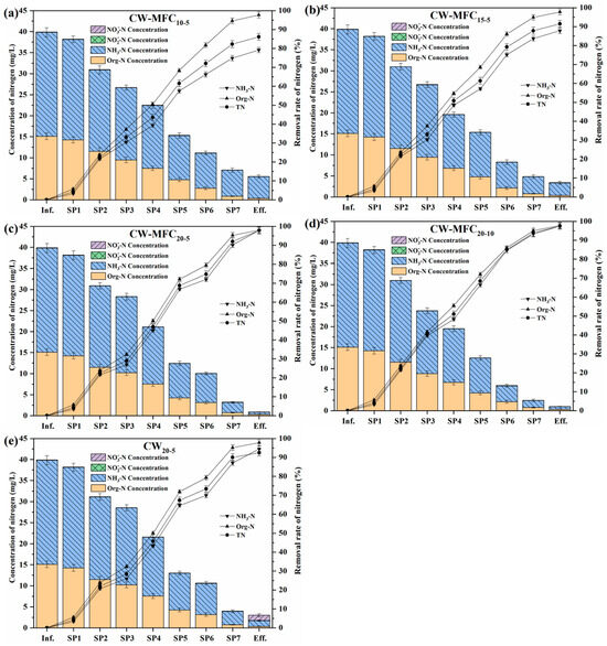 Nitrogen removal of the CW–MFC systems (a–e). Error bars are plus/minus one standard deviation.
