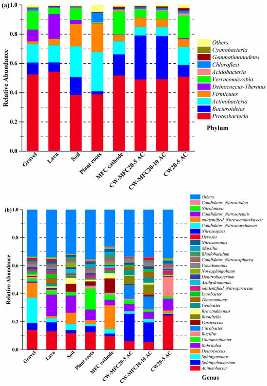 The microbial diversity in CW–MFC20-5, CW–MFC20-10, and CW20-5 is provided in Table 6. The diversity and richness of the microbial communities of gravel, lava, soil, and plant roots in CW–MFC20-5, CW–MFC20-10, and CW20-5 were similar, respectively, while the microbial diversity of AC (MFC anodes) in CW–MFC20-5 was higher than that of CW20-5 by 3.85% species, 4.07% Shannon, 1.64% Simpson, 3.37% Chaol, and 3.96% ACE. The microbial diversity of AC in CW–MFC20-5 was similar to that in CW–MFC20-10 but was higher than that of other types of substrates by 1.12–6.16%. This indicated that the depth of a single AC anode did not influence the microbial diversity. The MFC cathodes showed the lowest microbial diversity. This was because of the aerobic environment on the substrates’ surface, which resulted in the enrichment of aerobes on MFC cathodes. The plant roots showed the highest microbial diversity, which was due to the root exudates and the abundant aerobic/anoxic/anaerobic microenvironment in the rhizosphere.