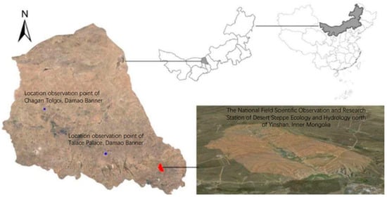 The observation experiment was conducted at the National Field Scientific Observation and Research Station of Desert Steppe Ecology and Hydrology north of Yinshan, Inner Mongolia (N 42°00′22″; E 109°45′54″) (Figure 1). The research station has an average altitude of 1600 m and covers an area of approximately 1.33 km2. The climate type is a temperate, semi-arid, continental monsoon climate, with an annual average temperature of 3.4 °C and an annual frost-free period of 106 d. The annual average rainfall is 246 mm and the annual average water surface evaporation is 2227 mm. The annual average wind speed at a height of 2 m is 2.47 m·s−1, with 68 d of strong wind annually. The soil texture is mostly sandy and light soils. The dominant grass species in the study area is Leymus chinensis, accompanied by desert grassland species such as Stipeae dumort, Artemisia frigida, and Calystegin hederacea Wall. The main plant growing season is from May to October.