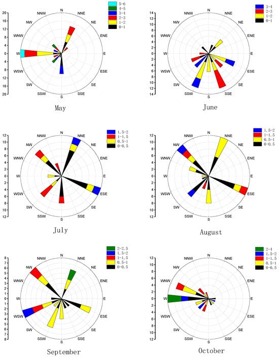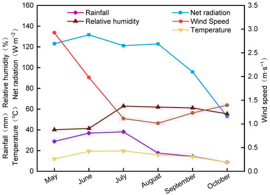 Meteorological data from the ENVIS meteorological station, produced by the IMKO company of Germany, were used to observe basic meteorological data in this study, such as wind direction and speed, total radiation, air temperature, humidity, precipitation, and others. The meteorological data for the growing season in the Xilamuren Desert Grassland in 2021 are shown in Figure 2. The monthly mean rainfall fluctuation range in the entire growth season (May–October) is 8.6–38.1 mm and the total rainfall is 144.3 mm; July accounts for 27% of the total. The monthly mean relative humidity fluctuation ranges from 40.13 to 62.92%, the net radiation ranges from 53.74 to 131.69 W·m−2, and the temperature ranges from 8.61 to 19.72 °C, all of which show a parabolic change from increase to decrease. The maximum rainfall, relative humidity, net radiation, and temperature appear in July and August, whereas, the wind speed in July and August reaches a trough. Extreme gale weather occurs from May to June, with higher wind speeds than those in July and August.