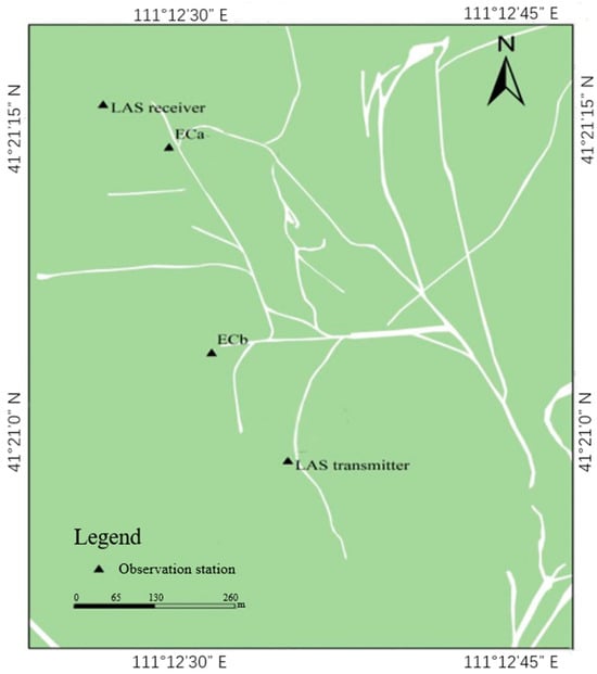 Exploring the relationship between the observed ET flux at single-point and regional scales is a newly developing research direction. The basic starting point is to combine the patch flux values of various surface types observed by the EC according to a certain average rule and compare them with the measured LAS value [26]. Therefore, this study took the Xilamuren Desert Grassland as the research area and used observation data from the National Field Scientific Observation and Research Station of Desert Steppe Ecology and Hydrology in the north of Yinshan, Inner Mongolia (hereafter referred to as the “research station”). The main objectives of this study were as follows: carry out ET observations at the micro-, point-, and surface scales; analyze the ET rules at different scales; study the relationship between spatial scales; and establish the scale conversion approach and method. This study has important scientific significance for understanding the ET characteristics of desert grasslands and also provides theoretical guidance for ecosystem restoration of degraded grasslands in this region.