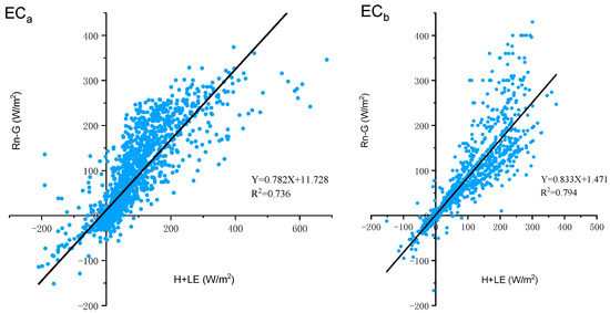 At present, the accuracy of observational data of Eddy-covariance systems according to the closure of the energy balance has been widely used by scholars worldwide. The specific calculation process is as follows [28,29]: