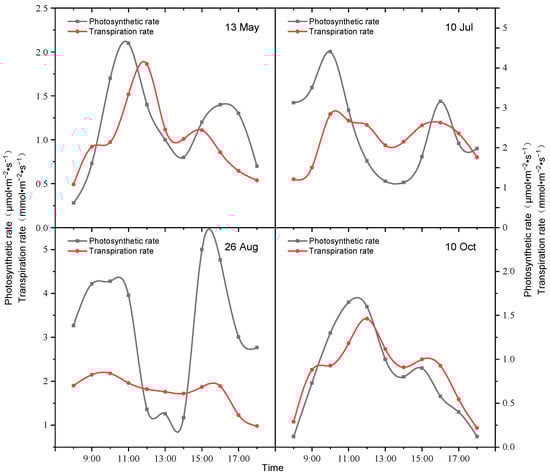 The daily photosynthetic and transpiration rates under natural conditions for four typical days during the L. chinensis growing season in 2021 are shown in Figure 5. The daily variations of the L. chinensis photosynthetic and transpiration rates in July and August (high-temperature months) were both bimodal curves, and their daily variation trends were similar. The first peaks both occurred before 10:00, and photosynthetic and transpiration rates decreased rapidly to a minimum at 13:00. The peak and valley photosynthetic and transpiration rates were 4.41 and 1.13 µmol·m−2·s−1, and 2.87 and 2.06 mmol·m−2·s−1 in July, and 4.28 and 1.17 µmol·m−2·s−1, and 2.18 and 1.72 mmol·m−2·s−1 in August, respectively. The difference between photosynthetic and transpiration rates is that the photosynthetic rate appears as a big “midday rest” phenomenon at 12:00–14:00, and the decreasing range in the transpiration rate was smaller than that of the net photosynthetic rate. The second peak appeared around 16.00, and the peak photosynthetic and transpiration rates were 3.16 µmol·m−2·s−1 and 2.43 mmol·m−2·s−1 in July and 4.79 µmol·m−2·s−1 and 1.89 mmol·m−2·s−1 in August.
