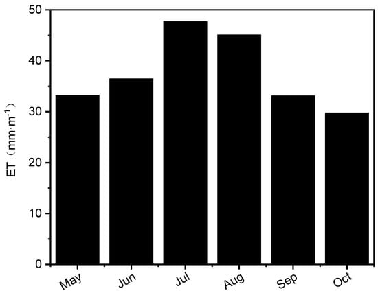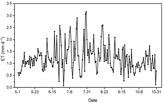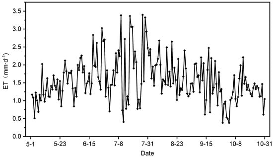 At the point-scale, the daily ET values fluctuated from 0.38 to 3.15 mm·d−1 during the growing season, with a big interdiurnal variation. The average daily ET value during the growing season was 1.366 mm·d−1 and the total accumulated ET was 251 mm. The ET exhibited obvious seasonality. October had the lowest total ET (<30 mm·mon−1) and the smallest interdiurnal variation, and July had the highest total ET (47.71 mm·mon−1) and significant interdiurnal variation. Due to meteorological factors, seasonal differences in ET were substantial. Overall, they exhibited a parabolic trend characterized by an initial increase followed by a decrease.