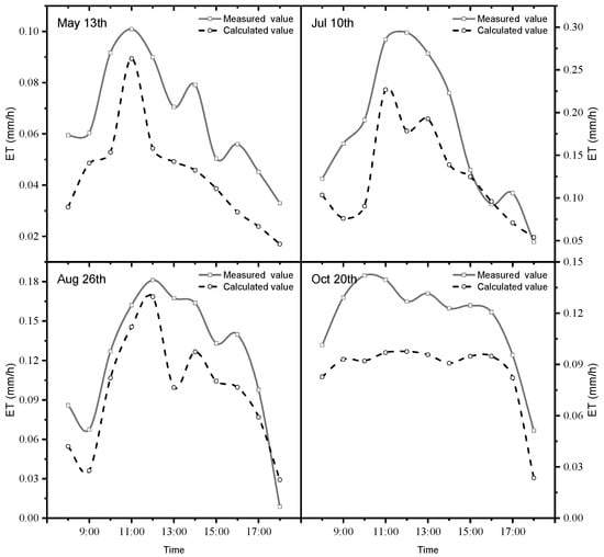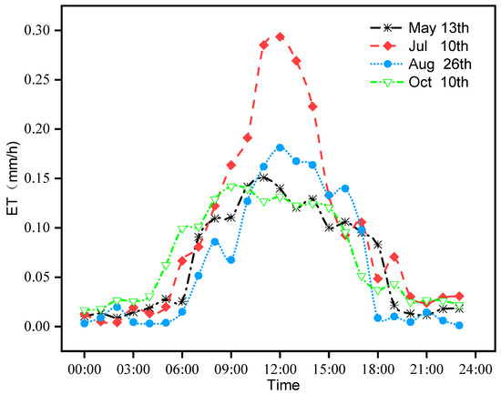 Figure 9 shows that the hourly ET on different typical days first increased and then decreased. On each typical day, the ET was relatively low at night, and the peak appeared between 12:00 and 14:00. On 13 May, the ET suddenly occurred at approximately 07:00 and then began to increase. The ET reached a peak of 0.15 mm·h−1 at 12:00, followed by a downward trend, and the daily accumulated ET was 1.57 mm. On 10 July, the ET was the highest and suddenly surged at sunrise (approximately 06:00); the highest value was 0.29 mm·h−1, and the daily accumulated ET was 2.33 mm. The changes on 26 August and 10 July were essentially the same, but the daily ET was lower. On 20 October, the ET change was relatively small, and the ET remained low; the highest ET was 0.14 mm·h−1, and the daily accumulated ET was 1.13 mm.