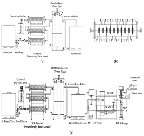 Schematic diagram of a sewage-reuse system. (a) Electrochemical floatation system (EFS). (b) Dimensionally stable anode (DSA) module. (c) EFS coupled with the separation membrane (MF/RO) process.