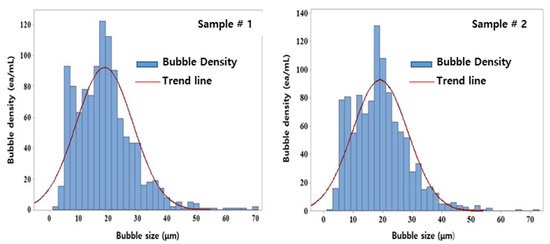 Table 3 and Figure 5 show the results of the measurement and distribution of the fine bubbles measured using the image analysis method. The average size of the bubbles generated by the fine-bubble generation system through catalytic electrodes ranged from 20 to 40 μm, and bubbles > 40 μm accounted for <5% of all bubbles formed. Normal bubbles, with a diameter of tens of μm, rapidly rose to the surface of the water body, ruptured there, and did not exhibit qualitative changes or an energy source. However, microbubbles generated by the catalytic electrodes slowly rose to the water surface and supplied oxygen particles in the bubble condition to water under the surface. They exhibited high air-dissolution efficiency due to the small bubble size when subjected to water treatment [24]. Therefore, a charging effect, a physical adsorption effect, and an oxidation effect for sterilization and cleaning are to be expected via generated bubbles for water treatment [25,26].