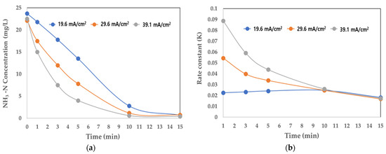 Changes in NH3-N and rate constant (K) according to current density. (a) Concentration of NH3-N (mg/L); (b) rate constant (K).