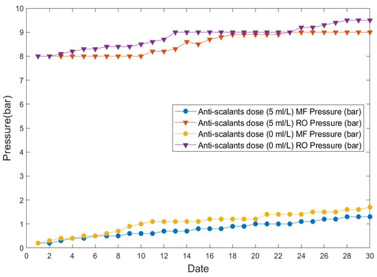 Anti-scalant-dependent pressure changes occurring in the separation membrane (MF/RO) process.