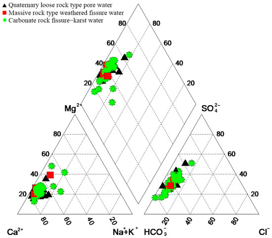 - In the groundwater in the three major aquifers in the Zihe River source region, the cations mainly consist of , while the anions are mainly . All water quality parameters comply with Class III water standards. The concentrations of remain relatively stable within the aquifers. However, within the study area, there is greater variability in the concentrations of , , , and , indicating a more pronounced influence of environmental factors. Groundwater in the quaternary loose rock pore water is primarily characterized by a hydrochemical type of HCO3·SO4-Ca·Mg. Groundwater in fractured weathered rock formations is predominantly of the HCO3·SO4-Ca type, while karst groundwater in carbonate rock formations exhibits a dominant HCO3·SO4-Ca·Mg hydrochemical type.