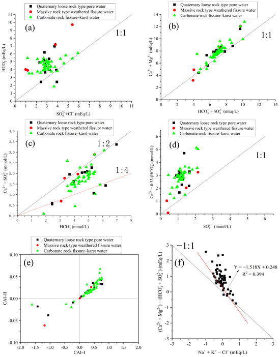According to Equations (1) and (2), it is understood that if the milliequivalent concentration ratio of to is close to 1, then and should come from the dissolution of carbonate and sulfate minerals such as calcite, dolomite, and gypsum. If the ratio is greater than 1, it indicates the dissolution of silicate minerals, while a ratio less than 1 suggests that filtration processes are accompanied by ion exchange adsorption processes (Abdelilader R et al., 2012) [21]. As depicted in Figure 3b, the concentration ratio of the samples approximately follows a linear distribution, deviating from the 1:1 line. This implies some dissolution of silicate minerals, but the majority of the analysis results are concentrated on both sides of the 1:1 equilibrium line. This indicates that carbonate rocks and sulfate rocks are the primary reactants in groundwater. Furthermore, due to minimal sulfur dioxide in rainwater, the rainwater has little contribution to the in groundwater. Hence, this study hypothesizes that the current composition of groundwater in the study area is related to atmospheric precipitation, but it is not a controlling factor. Various water–rock interactions occur during groundwater flow (Equations (1) and (2)), and our results indicate that these interactions are the controlling factors influencing the regional groundwater chemical composition.