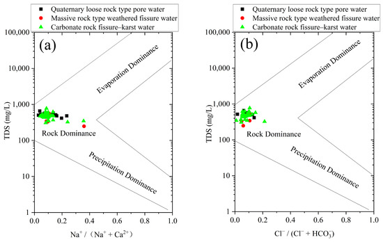 Gibbs plot of phreatic water samples in the study area: (a) and (b) versus TDSs.