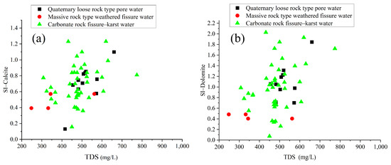 Subsequently, to further explore the mineral dissolution and precipitation patterns, the saturation indices (SI) of calcite, dolomite, gypsum, and anhydrite were computed using the geochemical software PHREEQC and compared with the TDS values of all collected water samples. The scatterplots of SI versus TDS for the three sample groups are presented in Figure 5.