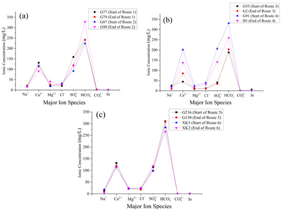 Line graphs depicting changes in the concentration of major ions along various simulated pathways. (a) Routes 1 and 2; (b) routes 3 and 4; (c) routes 5 and 6.