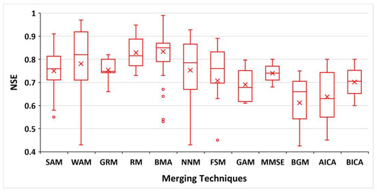 As a result, these terms can often be used interchangeably. In the trimmed mean approach, instead of using all the available forecasts, a subset of the forecasts is selected based on certain criteria, such as excluding outliers or models with poor performance. Compared to other techniques, the SAM requires minimal effort and does not involve empirical curve fitting. It provides merged forecast outputs that are better than the worst individual forecast in terms of accuracy [21,79]. In several studies, the performance of SAM varies from 0.72 (25th percentile) to 0.82 (75th percentile) with a mean value of 0.75 in terms of NSE metric (Figure 2). The accuracy of the SAM depends on the forecasting performance of the member models included in the combination [4,80]. Consequently, applying the SAM can help avoid having the worst-performing model in the merging process when information about the members is unavailable [21].