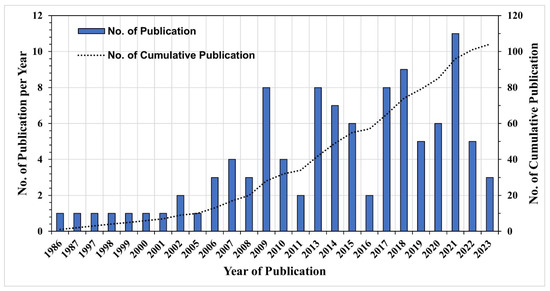 The fundamental differences among HFM techniques lie in the approaches used for model weight quantification and bias removal [3,15]. For instance, techniques such as multi-model super ensemble (MMSE), modified multi-model super ensemble (M3SE), and weighted averaging assign different model weights based on their performance. In the case of weighted averaging, the constrained least-squares approach is applied to compute positive model weights [4], while MMSE and M3SE techniques estimate model weights using multiple linear regression [27]. Regarding bias correction, the weighted average does not consider any bias correction. On the other hand, MMSE and M3SE techniques remove bias by replacing the simulation mean with the observed mean or by utilizing a streamflow-frequency curve, respectively [15]. The development of HFM techniques for the past 38 years, from 1986 to 2023, is presented in Table 1. Additionally, regardless of the application types and conditions, the efficiency of different merging techniques applied for merging streamflow simulation is provided in Figure 2. This figure presents the application results from different studies in terms of non-dimensional statistical metric, Nash–Sutcliffe Efficiency (NSE).